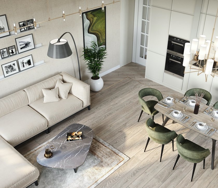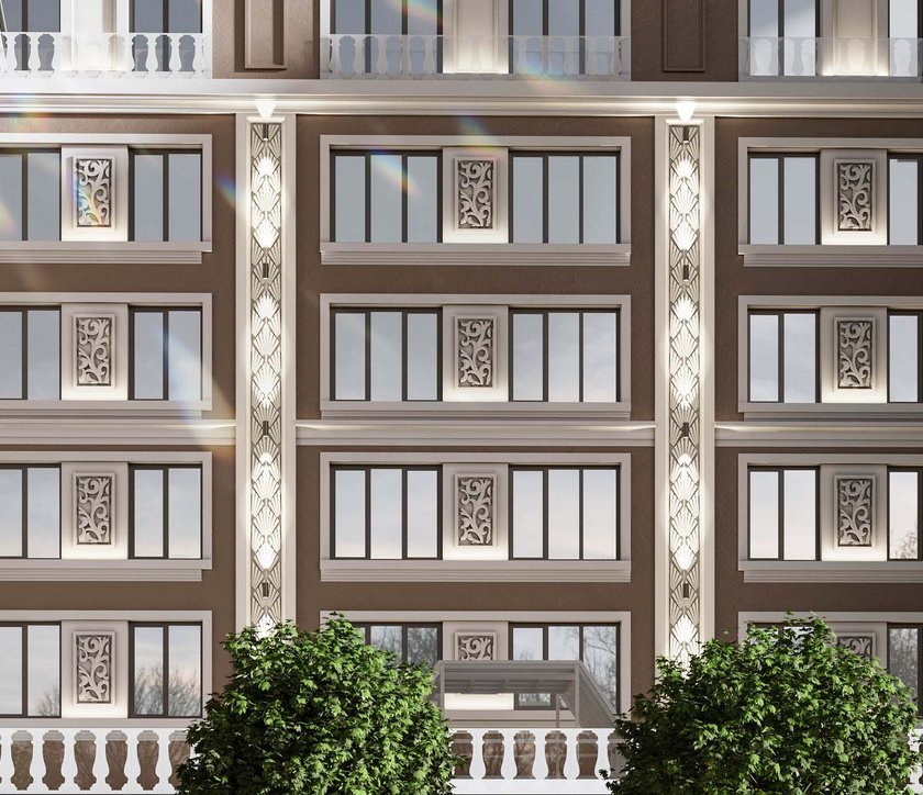 В доме шесть этажей. Если хочется, можно подняться на нужный этаж пешком по лестнице с дизайнерской отделкой и продуманным освещением.